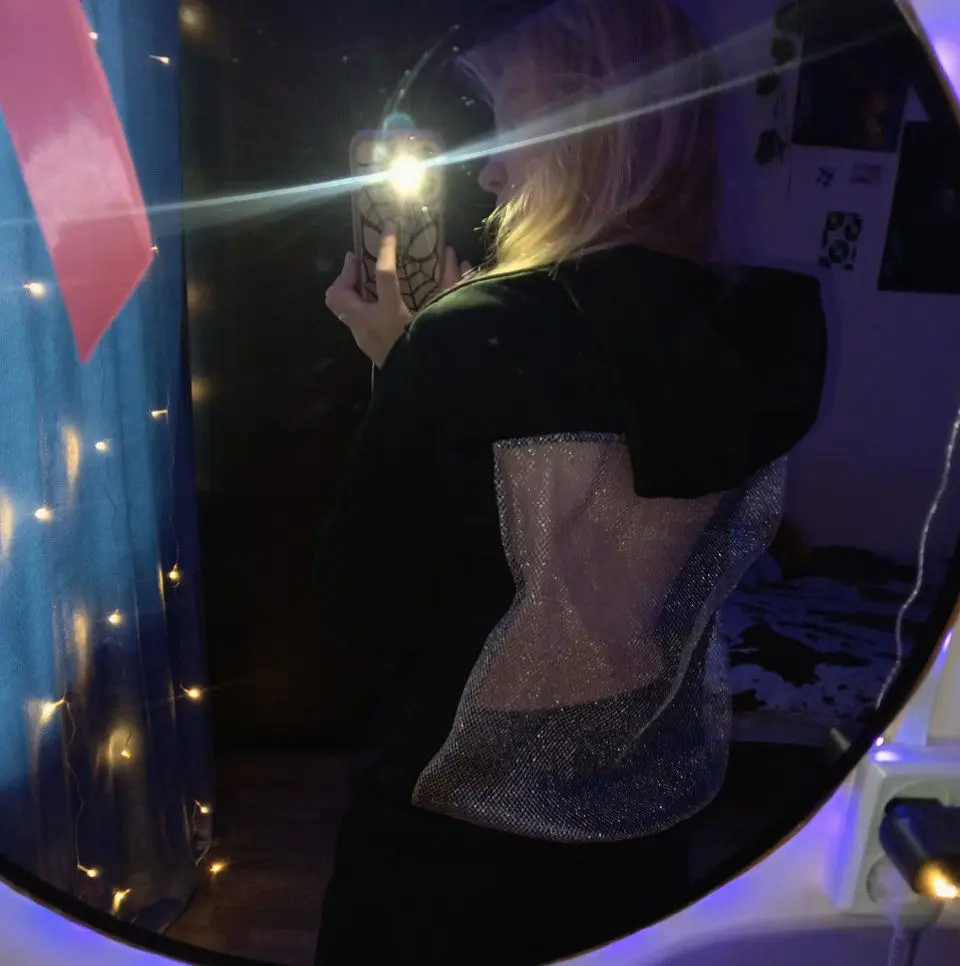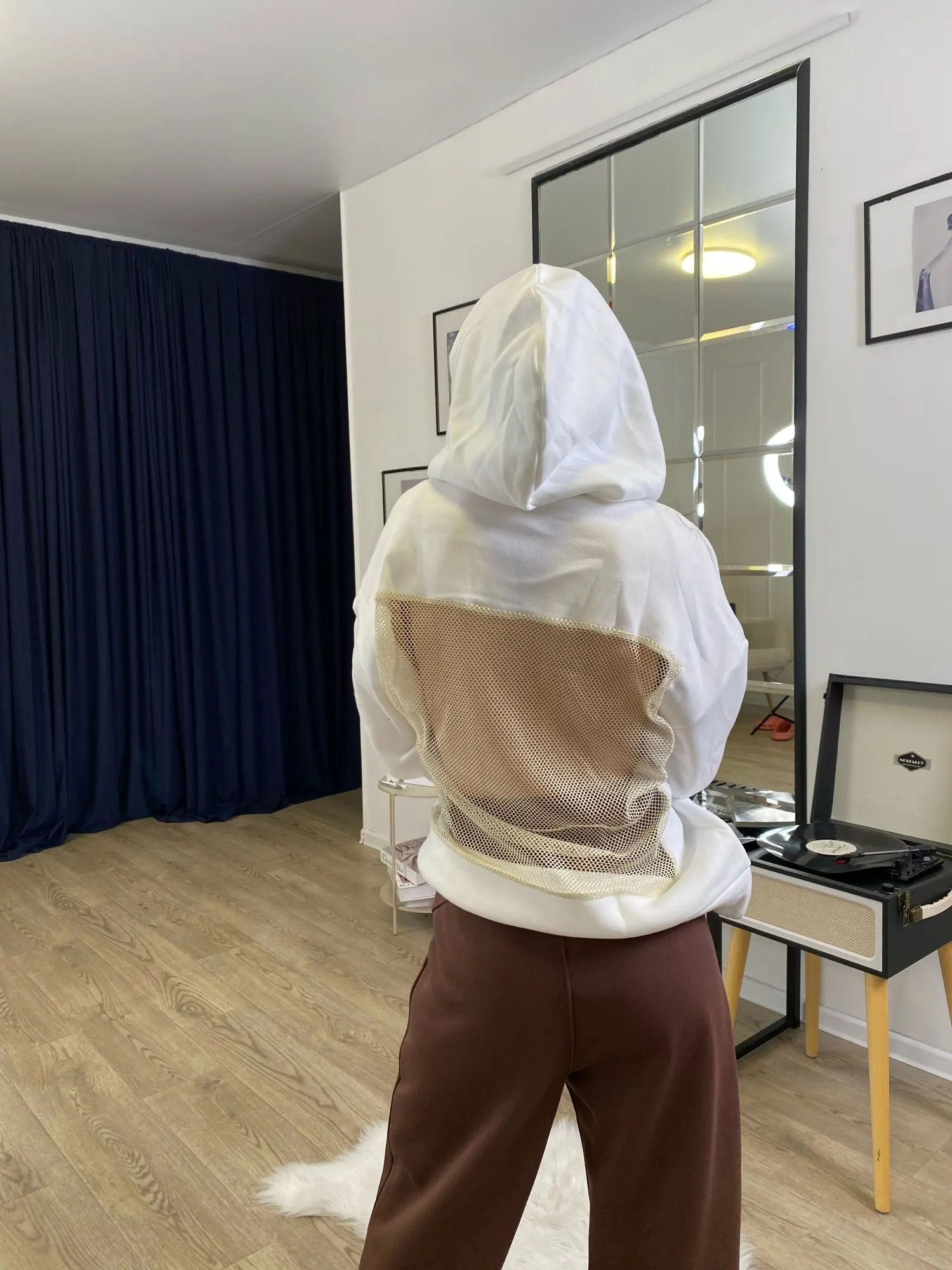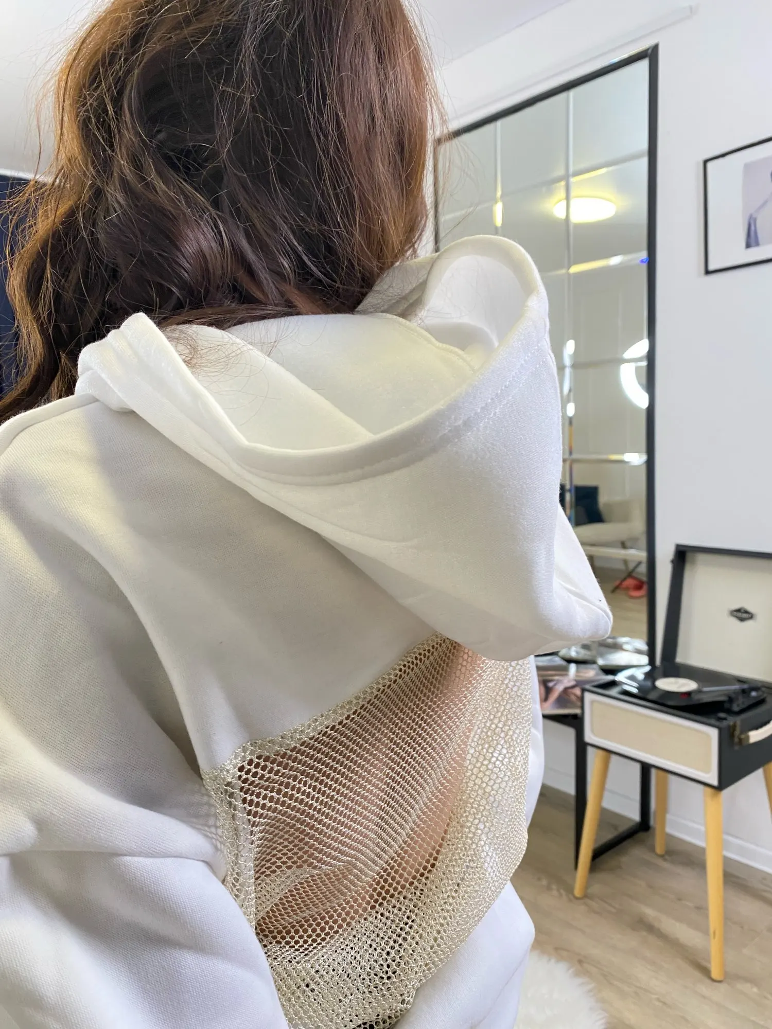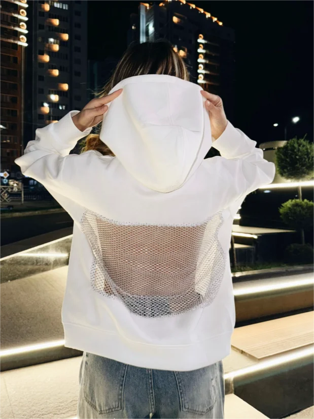 De face, le sweat à capuche ressemble à un sweat à capuche basique ordinaire—doux, chaud et très confortable. Mais quand j'ai vu le dos, honnêtement, j'ai été impressionné. Insert en maille, c'est le même accent qui rend l'objet unique et ajoute une véritable "perle" à l'image. À mon avis, le sweat à capuche ne diffère pas des photos dans la boutique du vendeur. Au fait, il n'a pas de pierres dessus, et cela est également mentionné, il suffit de faire défiler un peu vers le bas. Mais au soleil, ou devant la caméra, le maillage scintille de manière très cool, et voilà l'effet de pierres) Concernant le sweat à capuche lui-même, le tissu est agréable au toucher, ne bouloche pas, ne se détend pas et ne se déforme pas après lavage. Le maillage est dense, cousu avec une grande qualité, rien ne dépasse ni ne se déchire. S'adapte parfaitement à la silhouette — met en valeur la taille et ajoute un effet wow. 😍