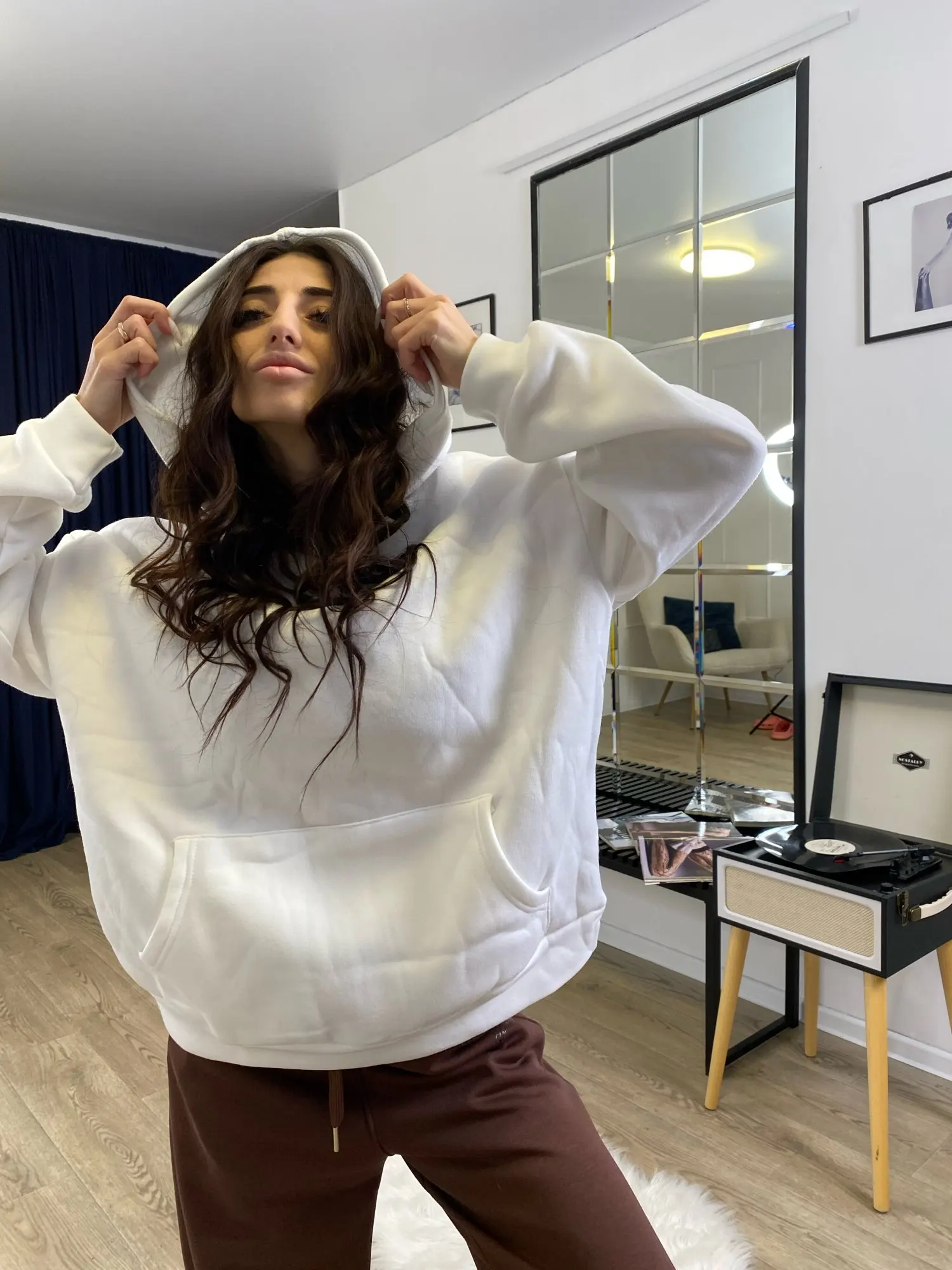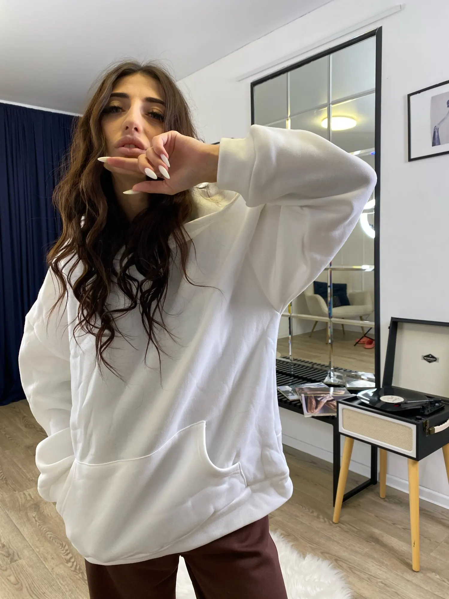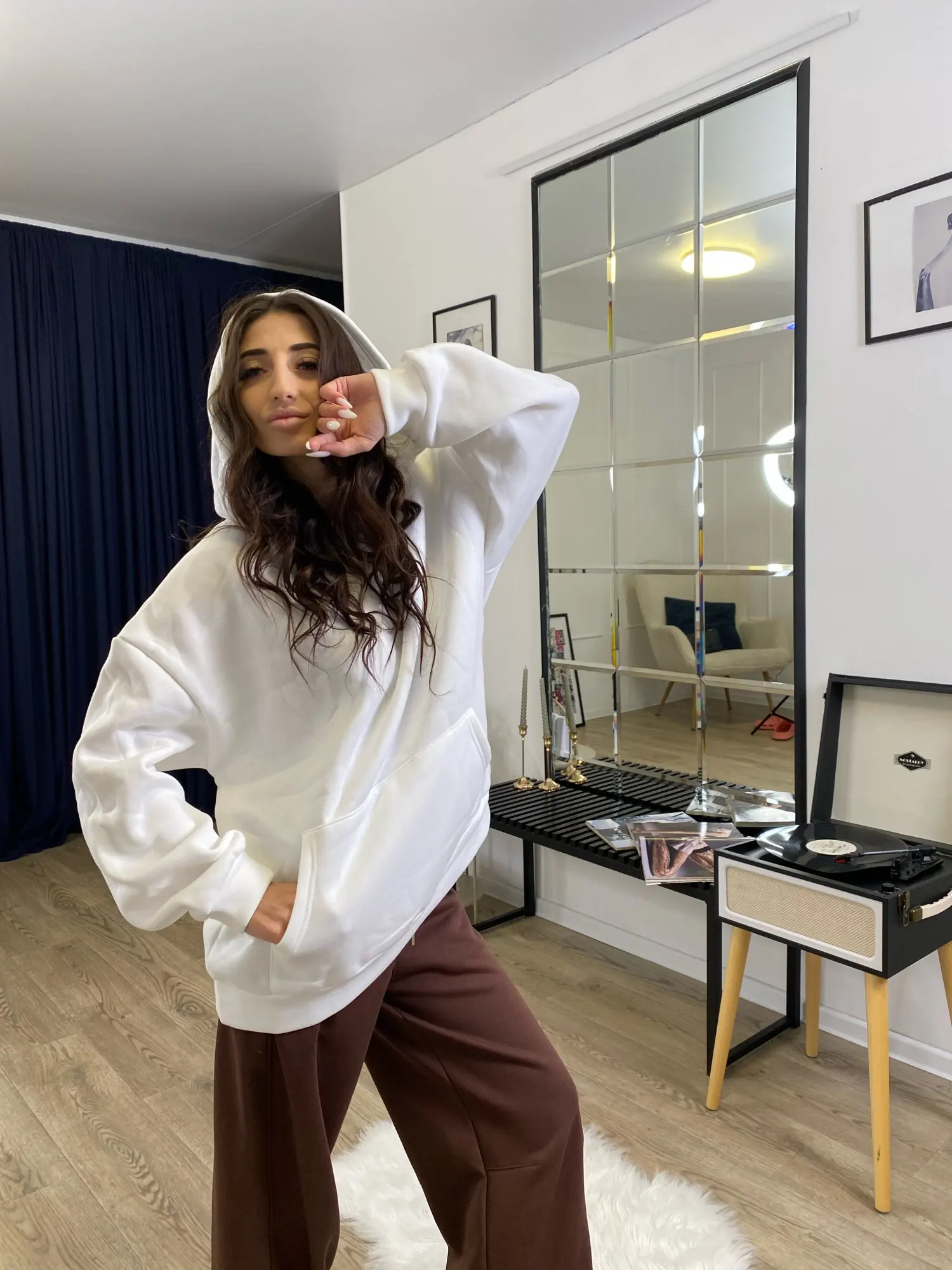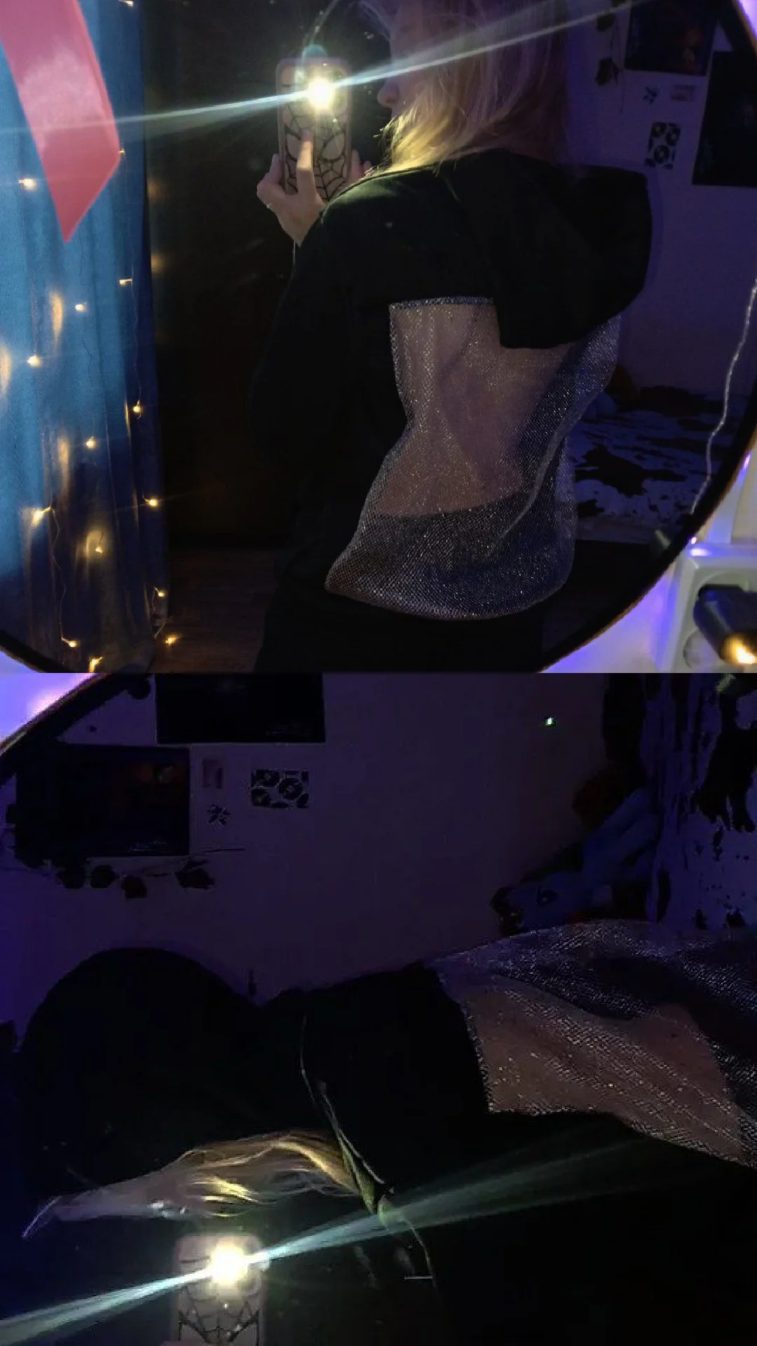 De face, le sweat à capuche ressemble à un sweat à capuche basique ordinaire—doux, chaud et très confortable. Mais quand j'ai vu le dos, honnêtement, j'ai été impressionné. Insert en maille, c'est le même accent qui rend l'objet unique et ajoute une véritable "perle" à l'image. À mon avis, le sweat à capuche ne diffère pas des photos dans la boutique du vendeur. Au fait, il n'a pas de pierres dessus, et cela est également mentionné, il suffit de faire défiler un peu vers le bas. Mais au soleil, ou devant la caméra, le maillage scintille de manière très cool, et voilà l'effet de pierres) Concernant le sweat à capuche lui-même, le tissu est agréable au toucher, ne bouloche pas, ne se détend pas et ne se déforme pas après lavage. Le maillage est dense, cousu avec une grande qualité, rien ne dépasse ni ne se déchire. S'adapte parfaitement à la silhouette — met en valeur la taille et ajoute un effet wow. 😍